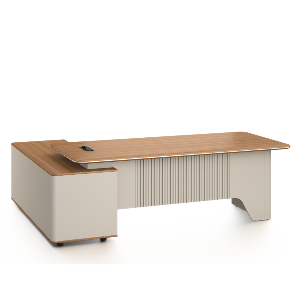 Executive Desk with Movable Side Extension – DG03 Series. Made from E1‑grade MDF with imported SCHATTDECOR melamine finish. Features a 40mm dual‑color tabletop, CNC‑carved front panel, and a separate side extension with drawers and cabinet. Includes password‑lock drawer, soft‑close hinges, and aluminium handles.