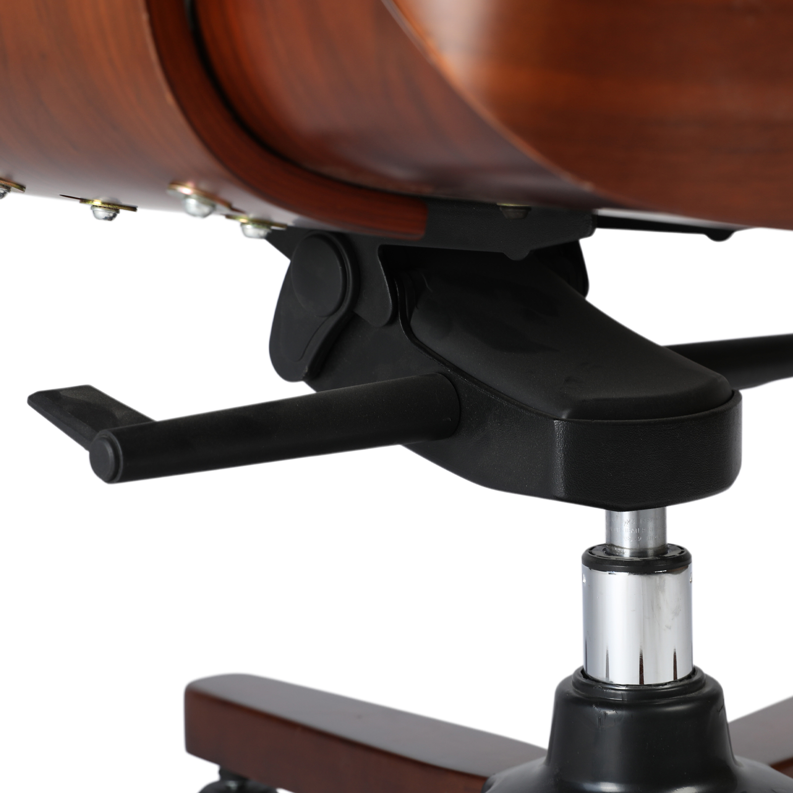 • Polished wood covered metal base with wheels.